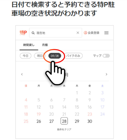 従来の駐車場は現地に行って空き状況を確認する必要がありますが、特Pならスマホで日付・時間を指定して確実に予約ができ、満車で困るリスクを大幅に減らせます。
